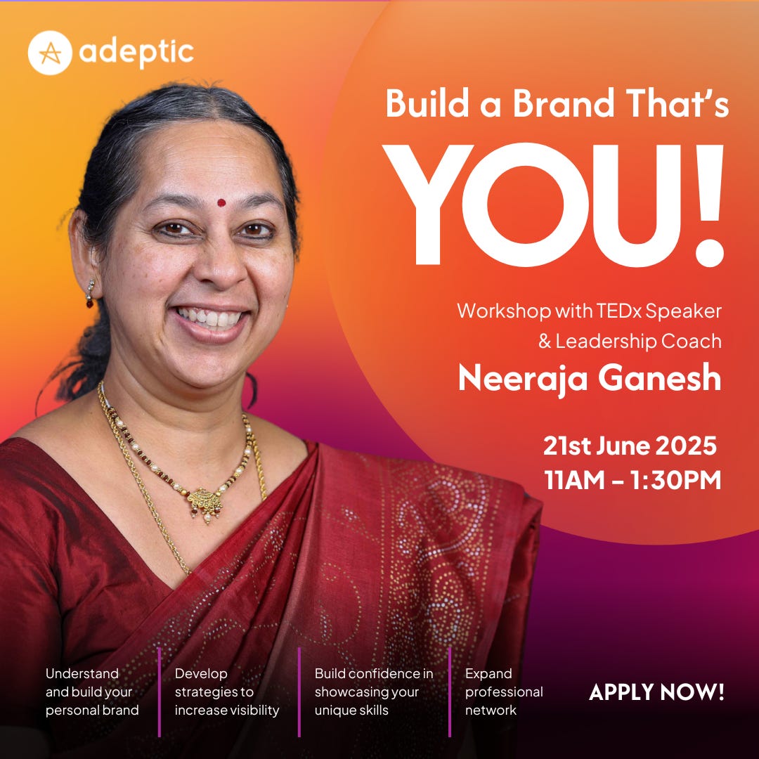 Our learning brand Adeptic Creative Labs has collaborated with Master Trainer, Leadership Coach and TEDx Speaker Neeraja Ganesh to bring this important workshop to professionals, freelancers and entrepreneurs. Neeraja’s own journey, rooted as it is in authenticity and plain speaking, is a testament to the power of personal brand building. The first cohort of this important workshop received rave reviews. Sign up to the second, and start building the most important brand of your life - Brand You!